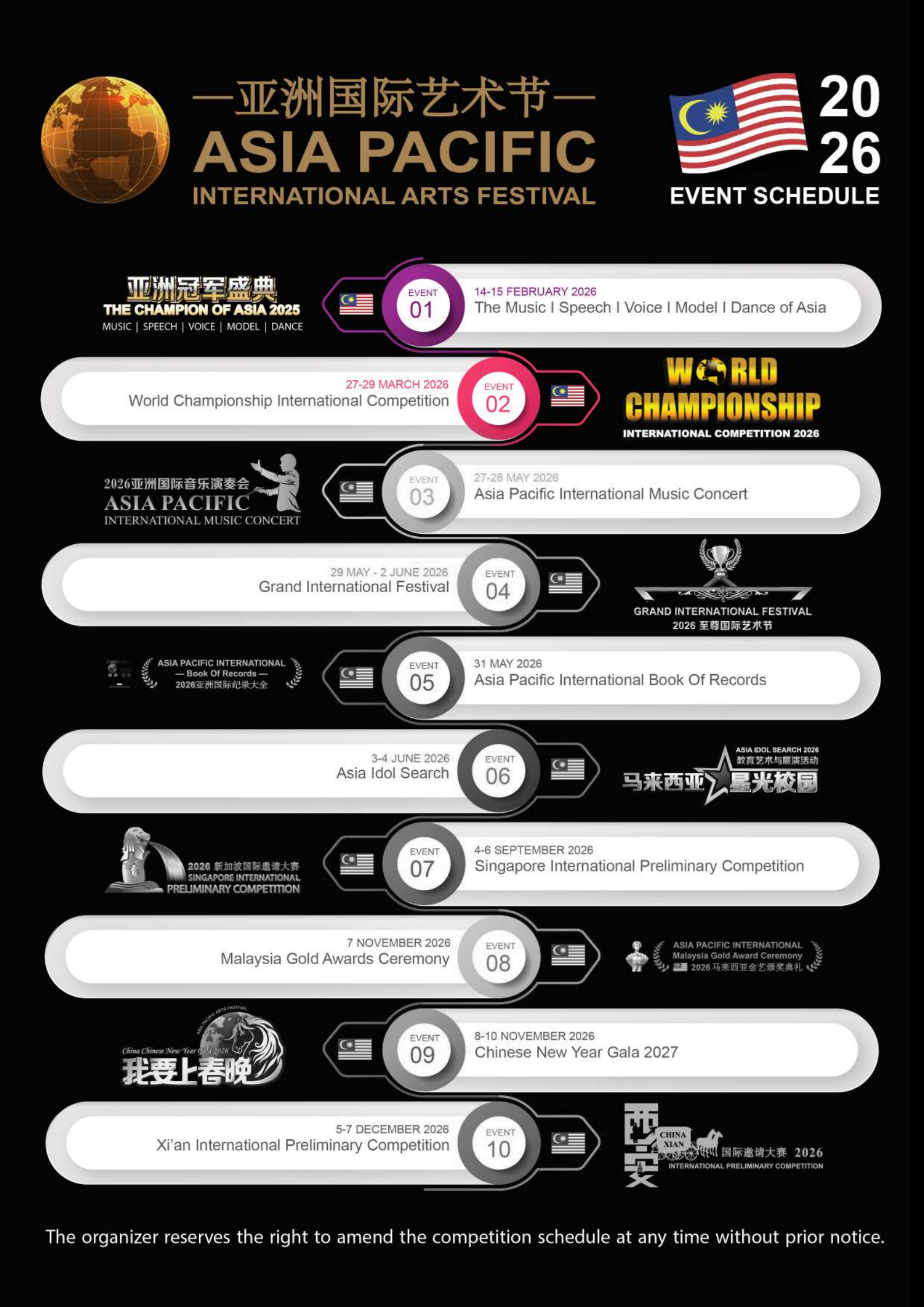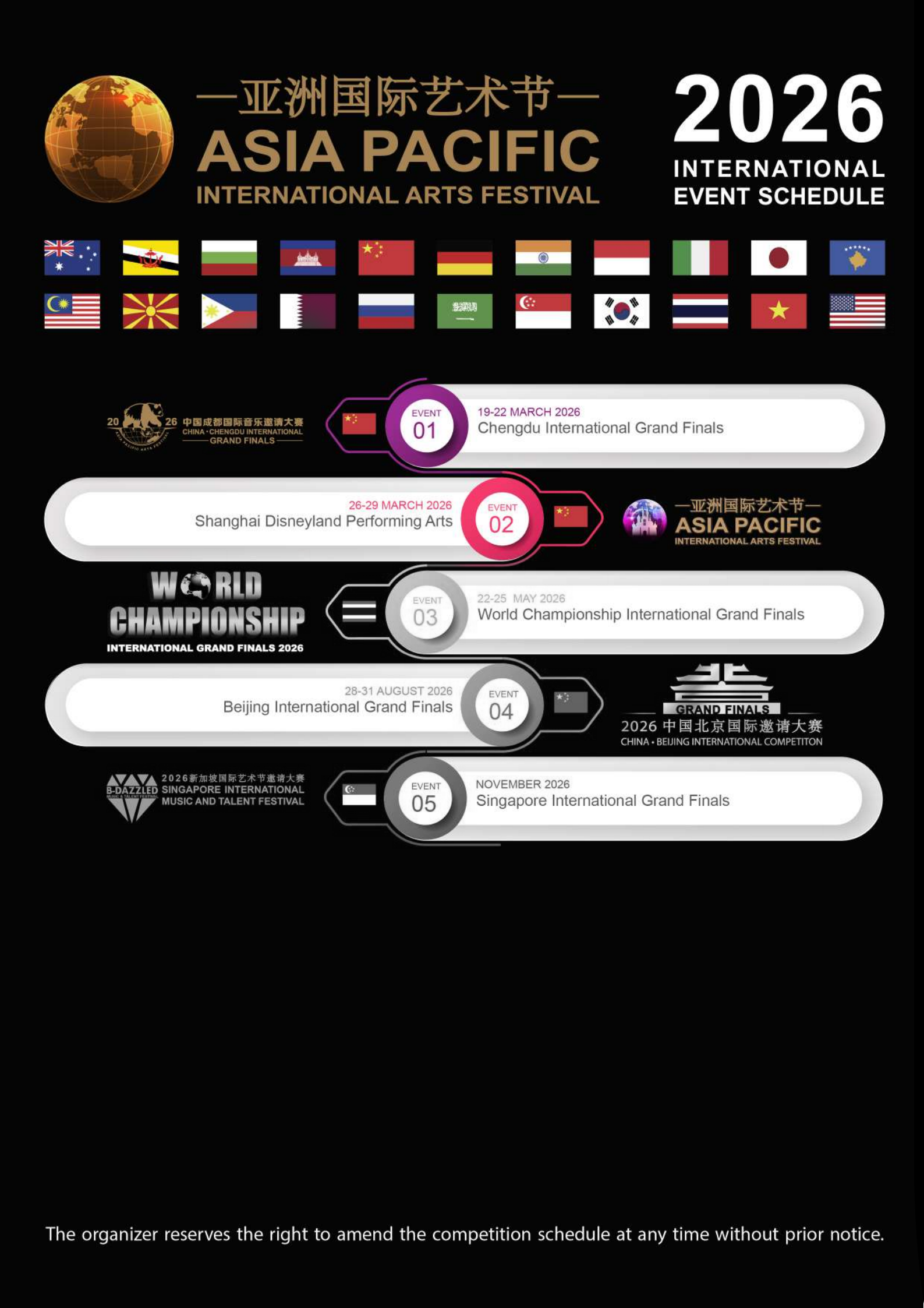 亚洲国际艺术节 • 教育与艺术展演活动由来自 25 个国家的艺术与教育机构联合主办,是一项具有高度国际影响力的音乐与才艺邀请赛盛会。活动汇聚了来自世界各国的参赛选手,包括澳大利亚、文莱、保加利亚、柬埔寨、中国、中国香港、中国台湾、德国、印度、印度尼西亚、意大利、日本、韩国、科索沃、马来西亚、菲律宾、卡塔尔、北马其顿共和国、俄罗斯、沙特阿拉伯、新加坡、泰国、越南、英国及美国等国家的广泛参与与支持。作为一项备受瞩目的文化盛事,亚洲国际艺术节获得多国官方与文化机构的认可与认证,充分展现了我们在拓展国际影响力与提升专业水平方面所取得的卓越成就。