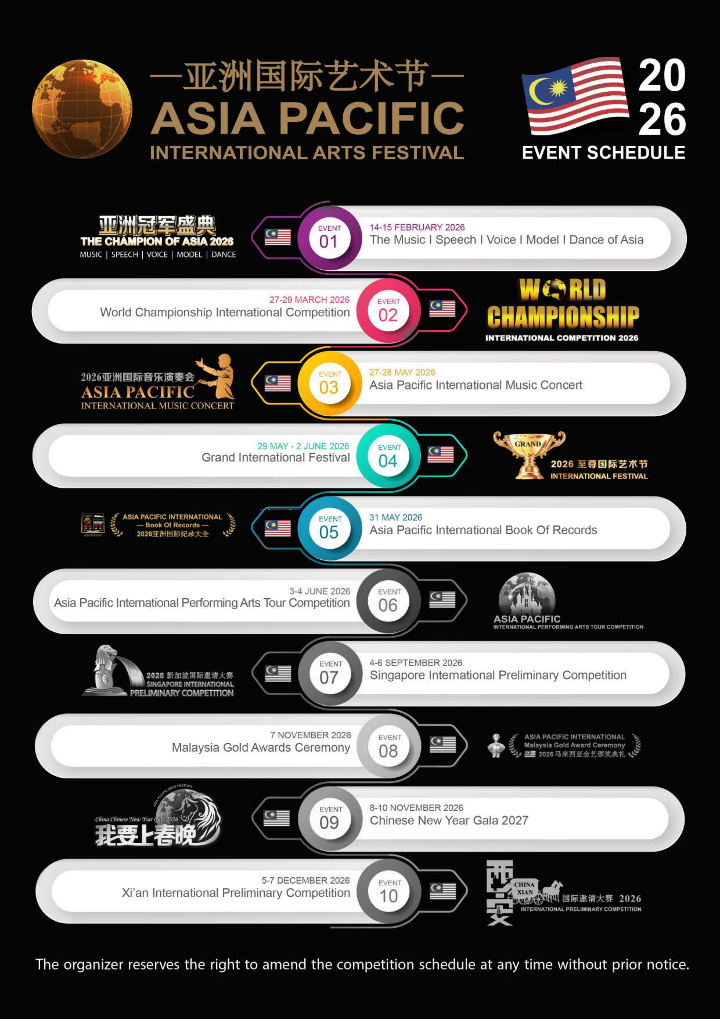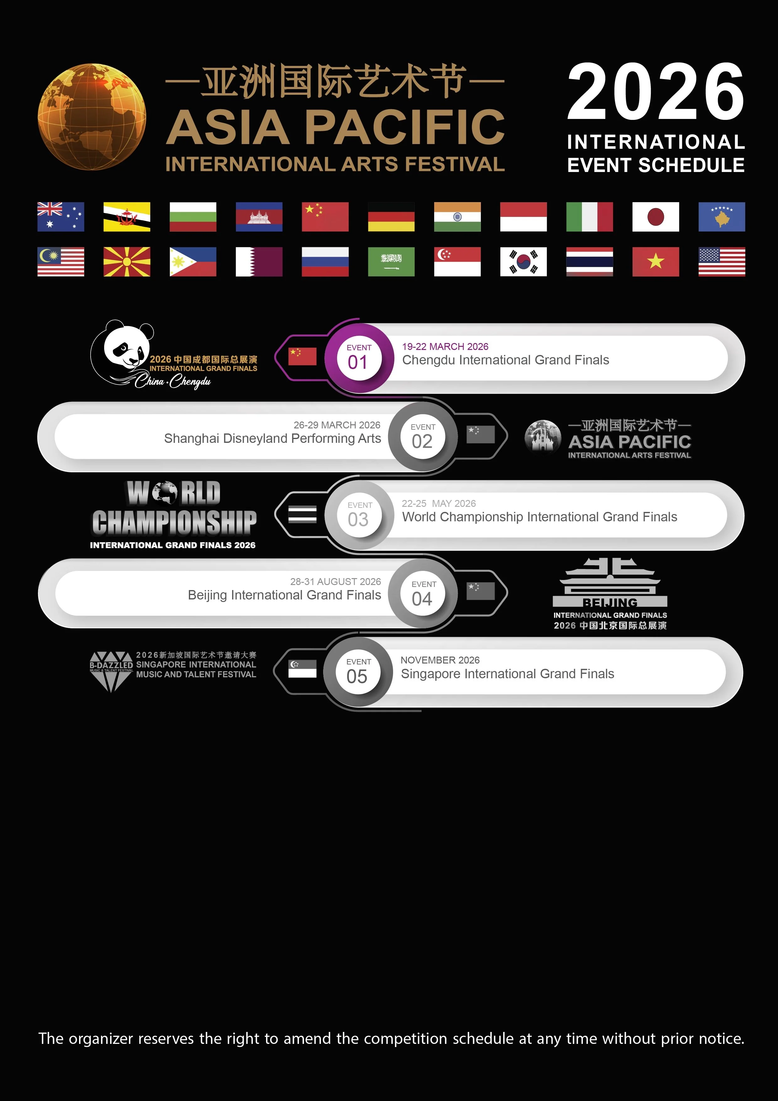 亚洲国际艺术节 • 教育与艺术展演活动由来自 25 个国家的艺术与教育机构联合主办,是一项具有高度国际影响力的音乐与才艺邀请赛盛会。活动汇聚了来自世界各国的参赛选手,包括澳大利亚、文莱、保加利亚、柬埔寨、中国、中国香港、中国台湾、德国、印度、印度尼西亚、意大利、日本、韩国、科索沃、马来西亚、菲律宾、卡塔尔、北马其顿共和国、俄罗斯、沙特阿拉伯、新加坡、泰国、越南、英国及美国等国家的广泛参与与支持。作为一项备受瞩目的文化盛事,亚洲国际艺术节获得多国官方与文化机构的认可与认证,充分展现了我们在拓展国际影响力与提升专业水平方面所取得的卓越成就。